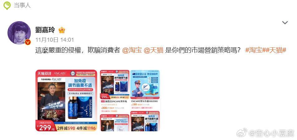 11月10日消息,刘嘉玲在微博喊话淘宝和天猫,指其平台上的一家保健品店铺使用梁朝伟肖像,涉嫌侵权。10日下午,“ENCARE海外旗舰店”客服人员回复红星资本局称,已经向品牌方反馈此事,并表示其品牌赞助了一档名为《大片很好看》的综艺节目,有(上述明星肖像)的使用权,目前品牌方正在和节目组沟通。